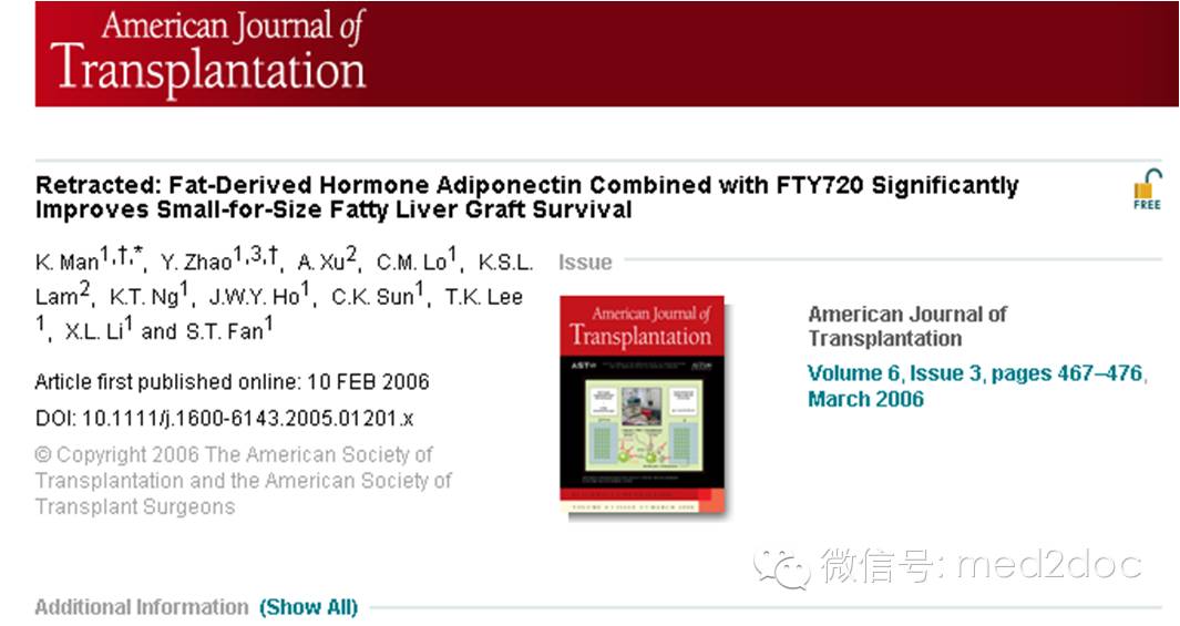 被撤回的两文题目分别为《雷帕霉素可减轻肝硬化接受者肝移植损伤——下调Rho-ROCK-VEGF通道的重要性》,(发表于2006年1月20日,以下简称A文)和《脂肪激素脂联素和FTY720结合可显著提升小体积脂肪肝存活率》(首次发表于2006年2月10日,以下简称B文)。