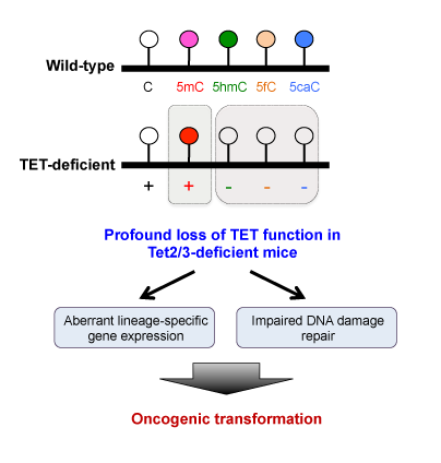 去除TET三个家族成员的其中一个(Tet1、Tet2和Tet3)——虽然不足以在模型系统中诱导成熟的白血病,但是会导致产生所有血细胞的干细胞的扩增。这个过程在TET功能损伤加剧的干细胞中更加恶化,例如,这项研究中在缺乏Tet2和Tet3的小鼠中所观察到的结果。自我更新能力增强,细胞优先分化为属于髓系的细胞,如巨噬细胞和中性粒细胞。