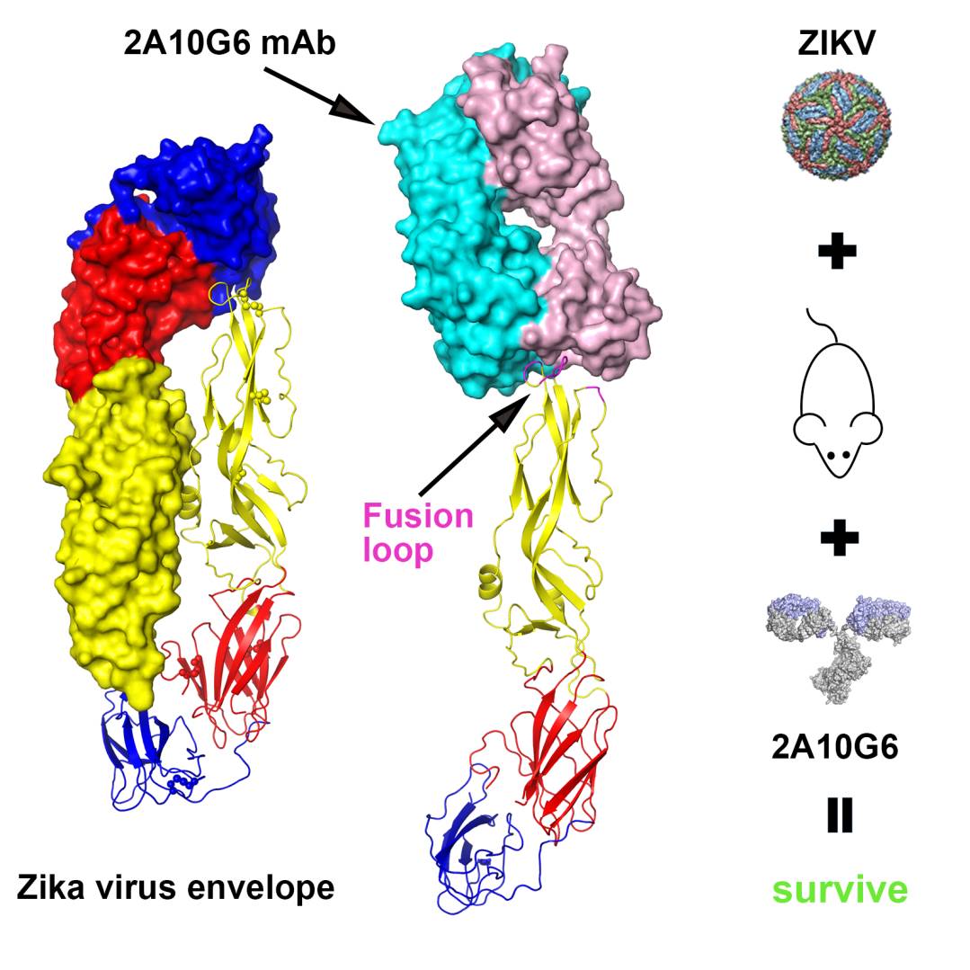 寨卡病毒与它所在黄病毒属的其它成员一样,由单一的开放读码框编码3个结构蛋白(C、prM/M和E),及7个非结构蛋白(NS1、NS2A、NS2B、NS3、NS4A、NS4B和NS5)。黄病毒的囊膜蛋白(E蛋白)主要负责病毒与感染宿主的受体的识别,介导病毒的入侵,因此是病毒最主要的保护性抗原。黄病毒的中和抗体一般通过靶向E蛋白从而阻止病毒的入侵,进而帮助宿主清除病毒。目前还没有针对寨卡的有效抗体的报道。