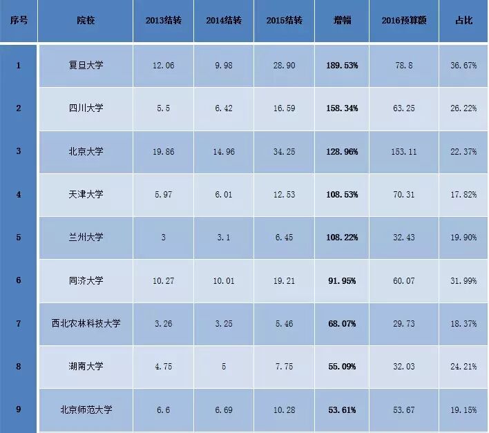 多数985高校上年结转经费增幅明显,哪些高校增幅高?
