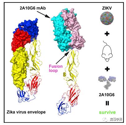 黄病毒的囊膜蛋白(E蛋白)主要负责病毒与感染宿主的受体的识别,介导病毒的入侵,因此是病毒最主要的保护性抗原。黄病毒的中和抗体一般通过靶向E蛋白从而阻止病毒的入侵,进而帮助宿主清除病毒。目前还没有针对寨卡的有效抗体的报道。 他们率先解析了高分辨率的E蛋白的三维晶体结构。研究发现寨卡的融合前E蛋白呈现二聚体构象,与黄病毒属其他成员的E蛋白的结构比较相似。但不同的是,寨卡病毒E蛋白的表面存在独有的一片正电荷区带。这一特性可能使得寨卡病毒对宿主吸附有所不同。此外,他们发现黄病毒E蛋白的融合肽区在寨卡病毒E蛋白上序列和结构都高度保守,因此选取了一种靶向到这一区域的黄病毒广谱中和保护抗体进行研究。这种称为2A10G6的抗体在他们之前的报道中能够有效的中和与寨卡病毒亲缘关系很近的其它黄病毒,包括四种血清型的登革热病毒、黄热病毒以及西尼罗热病毒。他们发现这种抗体对寨卡病毒的E蛋白具有很高的结合能力,并具有体外中和活性和小鼠的致死保护作用。进一步的抗原抗体复合物结构分析揭示出该抗体通过紧密的包裹对黄病毒入侵关键的融合肽区从而阻止病毒对宿主的入侵。