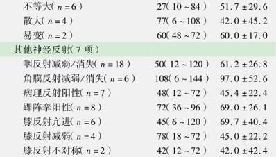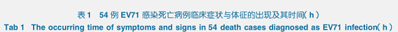 临床表现上,杨思达等对5家医院的54例EV71感染重症死亡病例进行研究,穷尽EV71感染重症病例临床表现93项,极具参考价值,如下图(54例EV71感染死亡病例临床症状与体征的出现及其时间)所示: