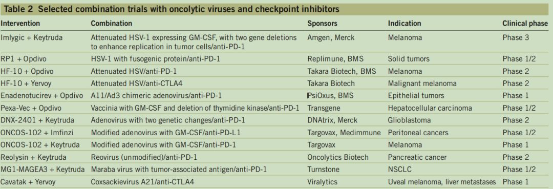1好事成双 与Imlygic一样,检查点抑制剂(溶瘤病毒)也很有吸引力。溶瘤病毒被选择或设计以发动不同方式来攻击癌细胞:到达肿瘤后,它们进入、选择性复制、裂解感染癌细胞,扩散至邻近细胞,释放包括肿瘤抗原在内的局部炎症信号。这些开启了免疫监视,潜在地触发了对癌细胞的适应性和先天系统性免疫反应。同时,检查点抑制剂使癌细胞表达用于逃避免疫监视的程序性细胞死亡受体1配体(PD-L1)的隐藏机制失效,使癌细胞对杀伤细胞毒性T细胞可见。许多肿瘤仍然耐受免疫杀伤:事实是PD-L1或其受体抑制,PD-1仅对已存在低水平免疫反应的少数实体瘤(如黑色素瘤)有效。对于许多其他类型的肿瘤(例如甲状腺癌和乳腺癌),体细胞突变水平相对较低。由于缺乏通过主要组织相容性复合物在细胞表面呈现的新抗原,使得此类肿瘤在免疫上处于“冷却”状态。溶瘤病毒被认为是一种激活局部免疫反应来“加热”肿瘤的方法。与溶瘤病毒的结合可以激活检查点抑制剂在更多类型的癌症中的潜力。 小临床实验的有效数据已经暗示了Imlygic和Keytruda组合的潜力,在一些环境下,目标回复率翻倍。一些专家预测这将得到证实在这些药物正在进行的备受期待的第三阶段试验中。“我预计T-Vec + pembrolizumab将成为治疗黑色素瘤的一个新的一线标准,”Robert Coffin说,Replimune的首席执行官,他没有参与该研究。 Imlygic是单纯性疱疹病毒1型(HSV-1)的一种具有复制能力的减毒衍生物,单纯性疱疹病毒1型表达人粒细胞巨噬细胞集落刺激因子(GM-CSF)。与野生型HSV-1相比,Imlygic在ICP34.5(神经毒性基因)和ICP47(免疫逃逸基因)以及完整的胸腺嘧啶激酶基因中均存在缺失,对抗病毒药物阿昔洛韦具有敏感性。招募700名患者Imlygy - keytruda iii期试验——MASTERKEY-265,“我们无法预测这项研究什么时候公布结果,”Amgen公司临床研究医学主任Sumita Bhatta说。 与此同时,一系列其他类型的病毒正在进行中期临床试验(除了Imlygic),选择或设计得越来越复杂以感染癌细胞,并在不同的肿瘤类型中招募免疫系统以发挥最大的作用。许多这样的目前也在与检查点抑制剂联合进行测试(表2)。 检查点抑制剂已经是高度成功的,而且是越来越热门的药物。领先的Keytruda和BMS Opdivo (nivolumab)是两种PD-1抑制剂,有望在2018年跻身最畅销药物前十名,根据来自EvaluatePharma的数据。