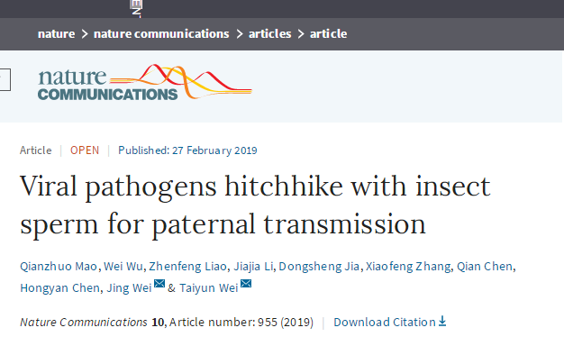 近日,Nature Communication杂志刊登了福建农林大学福建省植物病毒学重点实验室媒介传播病毒研究中心和福建农林学院中国闽台农作物生态病虫害防治国家重点实验室魏太云和卫静课题组的论文(如图),研究表明虫媒病毒垂直传播的首选模式是搭昆虫精子的便车而不干扰精子功能,从而促进了病毒在自然界的长期流行和存在。