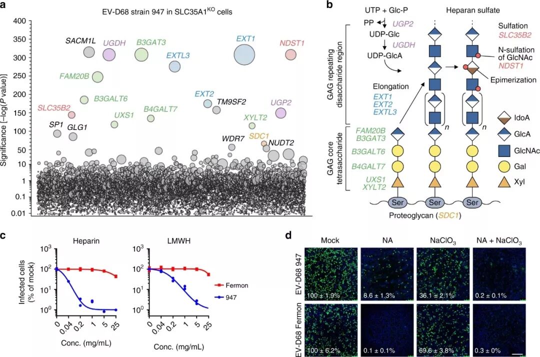 肠道病毒是人类疾病的主要原因。脂肪特异性磷脂酶A2(PLA2G16)最近被鉴定为泛肠道病毒宿主因子和潜在的药物靶点。 本研究,研究人员通过使用一种双糖受体结合的肠道病毒D68(EV-D68)株来鉴定PLA2G16逃避的可能机制。之前已经证明,这个毒株并不严格要求典型的EV-D68受体唾液酸,研究人员此次采用单倍体筛选来鉴定硫酸化糖胺聚糖(SGAG)作为其第二个糖链受体。值得注意的是,SGAG的参与使该病毒能够绕过PLA2G16。cryo-EM分析揭示了与唾液酸相比,SGAG通过结构变化刺激基因组从病毒粒子中释放,扩大了基因组出口的假定开口。 总之,本研究描述了一种可以绕过PLA2G16的肠道病毒,并识别出额外的病毒粒子不稳定性作为规避PLA2G16的潜在机制。