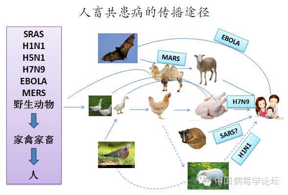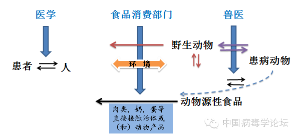 人兽共患病指在脊椎动物与人类之间自然传播的疾病或感染症,由人类和脊椎动物的共同或相似病原体引起,在流行病学上密切相关。很多人兽共患病既是畜禽的严重疾病,也是人类烈性传染病。目前已明确记载的人兽共患病超过200种,60%的人兽共患病来自动物,80%人兽共患病可寄生于多种宿主,75%新发传染病为人兽共患病。132种新兴人致病性病原微生物中,有99种为人兽共患病病原微生物,能够引起人类疾病的人兽共患病病原体是非人兽共患病病原体的2倍。一些传统流行病的病原体通过变异再度肆虐人兽,如鼠疫、肺结核、狂犬病、布鲁氏菌病、登革热等;新出现的传染病对人类造成新威胁,如艾滋病、SARS、埃博拉病毒、高致病性禽流感等。 人兽共患病可通过食物链传播,进而影响动物源性食品安全(如下图所示)。随着市场经济的发展,动物及动物产品流通日益频繁,增加人兽共患病的传播风险,严重影响动物性食品的质量,危害了消费者利益,威胁人的生命与健康。目前,我国动物源性食品中常见的污染病毒有其流感病毒、狂犬病毒、口蹄疫病毒及朊病毒(疯牛病);污染的细菌有高致病性大肠杆菌,沙门氏菌、金黄色葡萄球菌、链球菌、肉毒杆菌、结核病、布鲁氏菌病及李斯特菌;污染的寄生虫有绦虫,囊虫,弓形虫,旋毛虫等。 注:蓝色箭头是可控途径;红色及紫色箭头是不可控或逃逸控制;排泄物和患病动物体内的病原体可在环境中传播;在发展中国家,许多动物用于农业生产,当这些动物老了或患病时,也会屠杀买卖(虚线部分),而不是直接销毁。大多数野生动物携带高致病性及致死性病原体。在发展中国家,人与动物的接触比较频繁,因此,人兽共患病的发病风险相对高于发达国家。