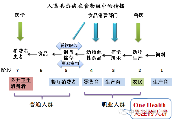 注:“从农场到餐桌”方案展示了传染性疾病在食物链中的传播过程。One Health 更加关注职业人群的健康与各部门之间的合作协调。