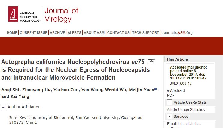 中山大学生命科学学院袁美妗组在杆状病毒功能基因研究方面取得重要进展,研究揭示了高度保守的ac75基因可影响核衣壳出核和核内微囊泡的产生。该成果在线发表于国际病毒学期刊Journal of Virology上。原文题为“Autographa californica Nucleopolyhedrovirus ac75 is Required for the Nuclear Egress of Nucleocapsids and Intranuclear Microvesicle Formation”。