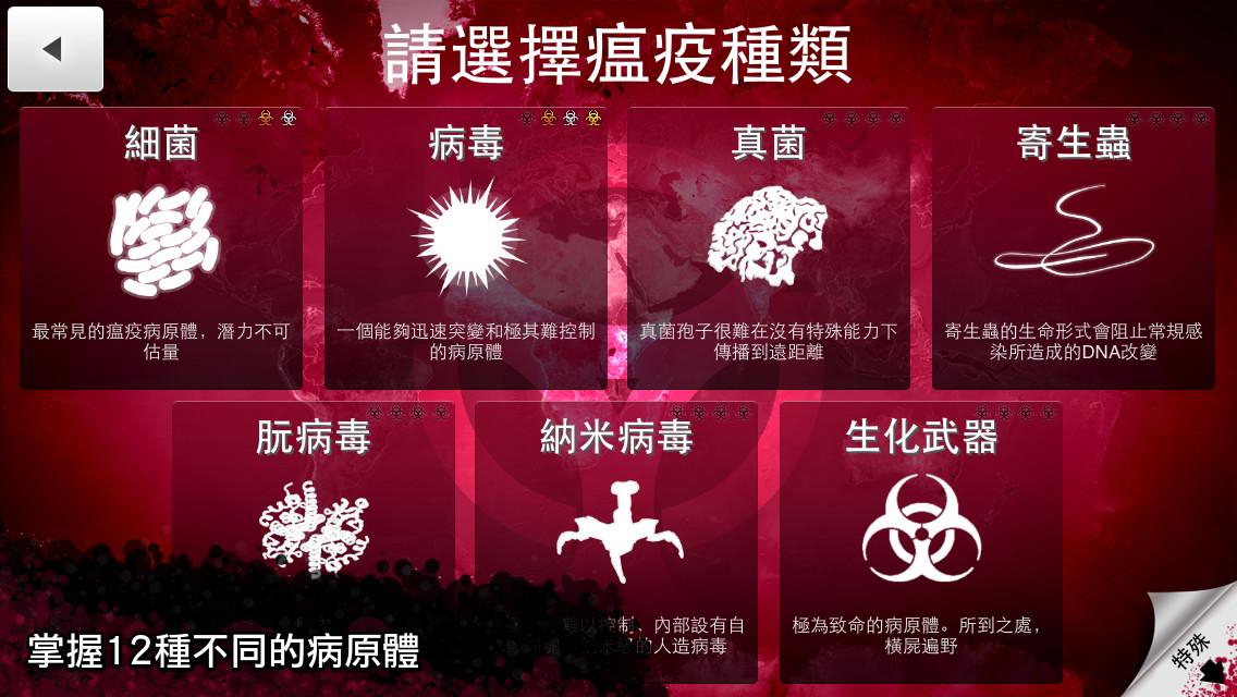 注意:游戏为内购破解版,可以解锁全部病毒和作弊模式,需要联网、安装GPLAY商店、和登陆谷歌账号 ()1.点击购买金币,确认付费,弹出GPLAY商店 2.等一会会弹出“此版本的应用未配置通过”,点击确定,等待LOADING 3.回到游戏即可解锁。 - 如果默认不是中文,请进游戏点击左上角齿轮,进入后在点击右上角一个带加号的齿轮标志,选择繁体中文,选择后退出游戏在进一次即可。 - 在选择瘟疫种类的界面,点左下角的解锁,然后选择全部,再点恢复购买纪录即可解锁所有内容。 - 已去除广告