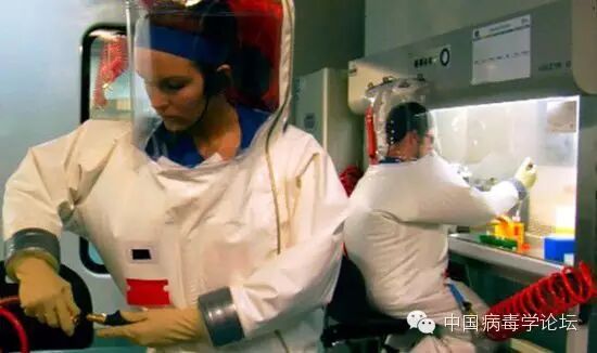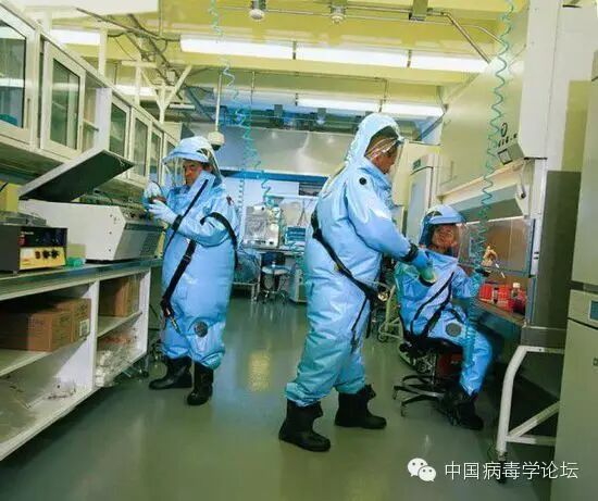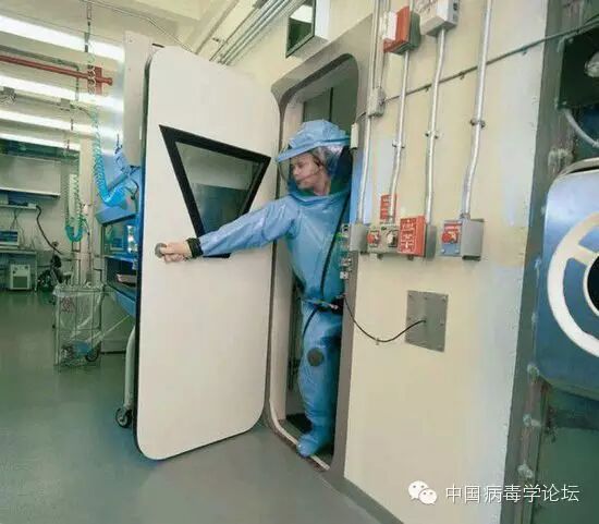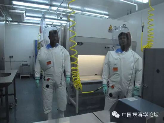进入实验室的研究人员都必须换上隔离正压防护服。这种防护服头部是透明的充气罩,下端连接着一条蓝色的呼吸带,呼吸带另一端悬挂连接在屋顶的管道上,这样保证研究人员在防护服内进行呼吸循环,和外界空气不发生任何接触。工作人员离开实验室时也必须经过化学淋浴消毒正压防护服表面。