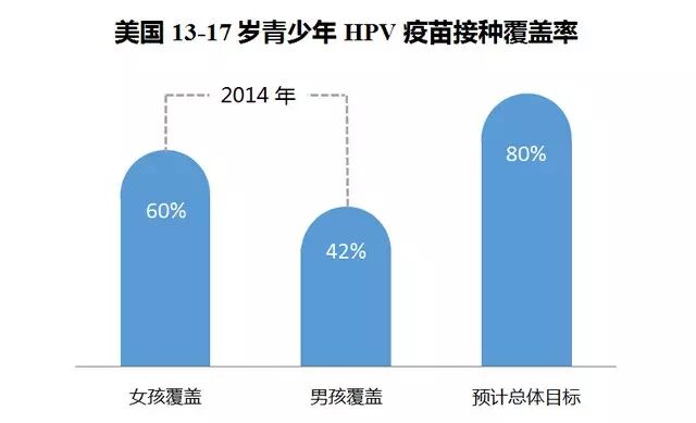据 2015 年 6 月美国疾病控制与预防中心官方公布的最新统计数据显示,2014 年美国 13-17 岁青少年中女孩和男孩接种覆盖率分别达到了 60%、42%,并期望未来总体覆盖率可以达到 80% 左右,理想目标值直逼百白破疫苗接种覆盖率。 美国 13-17 岁青少年 HPV 疫苗接种情况.jpg