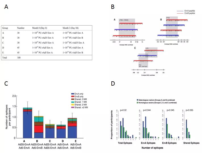 180 participants were randomized to combinations of adenovirus vectors (Ad5 or Ad35) and HIV-1 envelope (Env) gene inserts (clade A or B) in a prime-boost regimen.