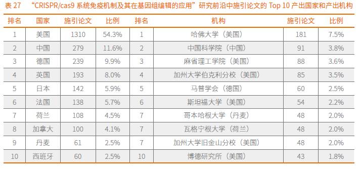 该研究前沿的核心论文主要分布在美国、荷兰、法国、加拿大、英国、瑞典、德国、俄罗斯和中国(表26)。其中,美国在该领域有较强的优势,拥有39篇核心论文,占比近80%。在Top机构中,美国占了8家,其中哈佛大学、加州大学伯克利分校、麻省理工学院和博德研究所是该领域较有影响力的机构。