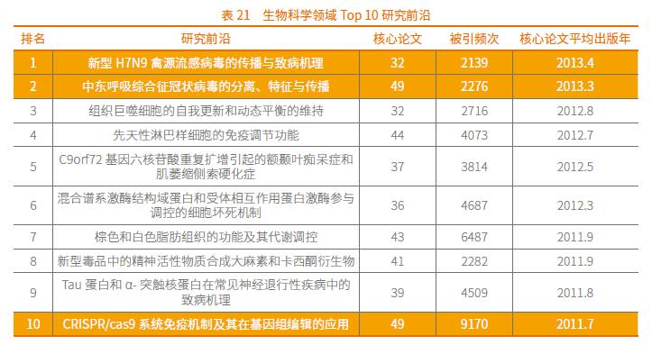 生物科学领域位居前10位的研究前沿主要集中于医学与人类健康的研究,包括病毒的传播、致病机理及免疫机制等方面。根据核心论文数量和被引频次等指标,生物科学共遴选出三个重点热点前沿:“新型H7N9禽源流感病毒的传播与致病机理”、“中东呼吸综合征冠状病毒的分离、特征与传播”和“CRISPR/cas9系统免疫机制及其在基因组编辑的应用”。其中“新型H7N9禽源流感病毒的传播与致病机理”、“中东呼吸综合征冠状病毒的分离、特征与传播”等的核心论文平均出版年都在2013年,为本年度所有热点前沿中最年轻的,这表现出科学家对人类突发性疾病的快速反应。