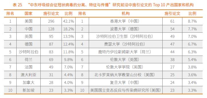 对施引论文国家和机构的分析表明,美国仍然是施引论文产出最多的国家,而中国在后续研究发展快速,赶超沙特阿拉伯、荷兰、德国、英国等国,位居第二(表25)。在Top10的施引机构中,除了香港大学、德国的波恩大学、沙特阿拉伯卫生部等机构外,还新增了美国的北卡罗来纳大学教堂山分校、美国国立变态反应与传染病研究所和中国的复旦大学等后起之秀。
