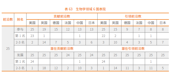 在潜在贡献度和潜在引领度方面,中国的表现接近于德国的水平,25个前沿中,他们分别获得11或12个前3名,其中中国在“新型H7N9禽源流感病毒的传播与致病机理”热点前沿仍位居首位。