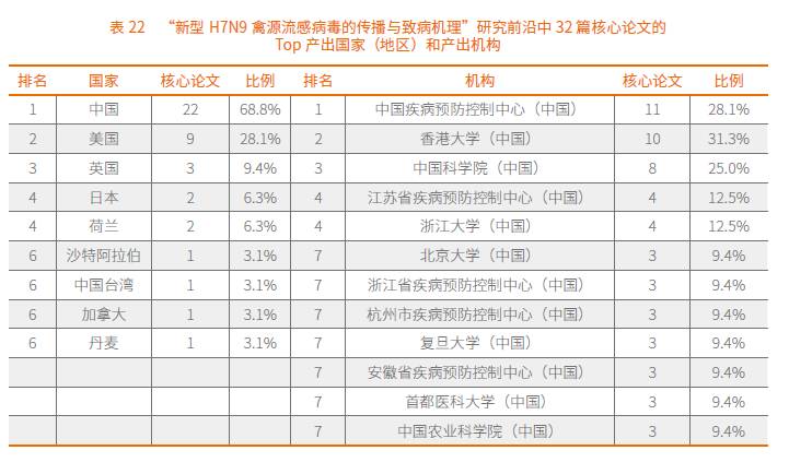 从核心论文国家分布来看,“新型H7N9禽源流感病毒的传播与致病机理”研究主要分布在亚洲、北美和欧洲等地区。其中,中国在该前沿的研究中占据重要地位。中国贡献了60%以上的核心论文;美国次之,共有9篇核心论文,占30%左右。从核心论文的机构分布来看,该研究前沿的重要机构均出自中国。其中,中国疾病预防控制中心、香港大学和中科院等机构表现突出,核心论文超过20%以上(表22)。